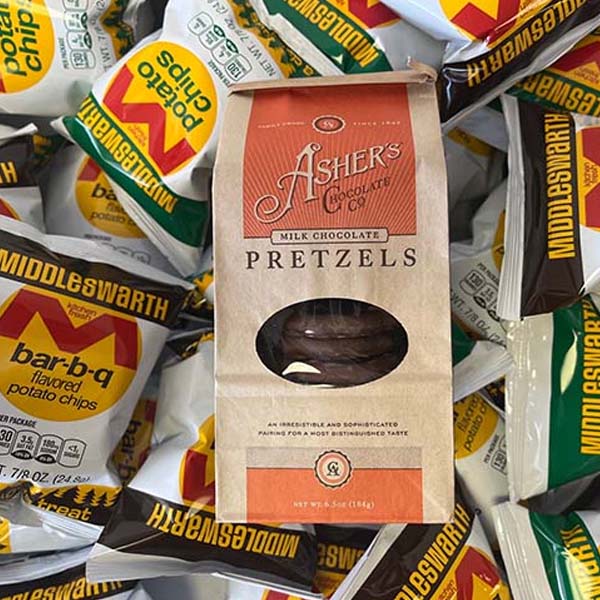 Contains 18 snack size bags of Middleswarth Chips and a 6.5oz bag of Asher’s Chocolate Covered Pretzels.